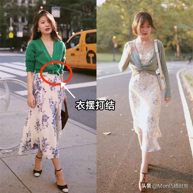 不如换个思路,在腰部给衣摆打个结,既能提高腰线,垂感裙摆还能遮肉,一举两得!
