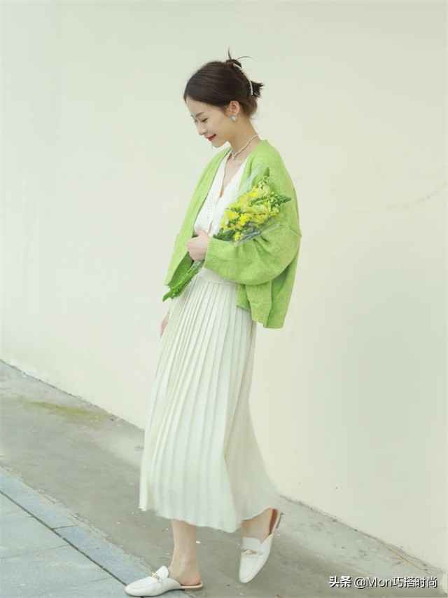 春天想穿出大长腿,一条纯色连衣裙加件短款上衣就行。米白色百褶裙温柔清新,配件绿色上衣,春天氛围感拉满!