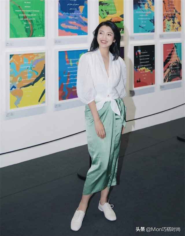 白衬衫加绿色包臀长裙,简单系个结,整体立马高级起来。