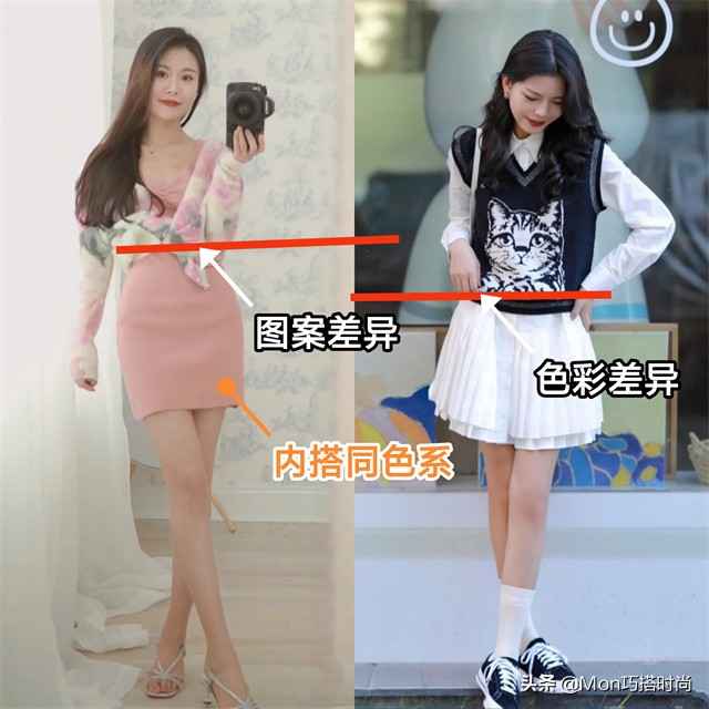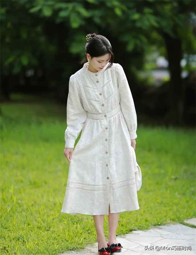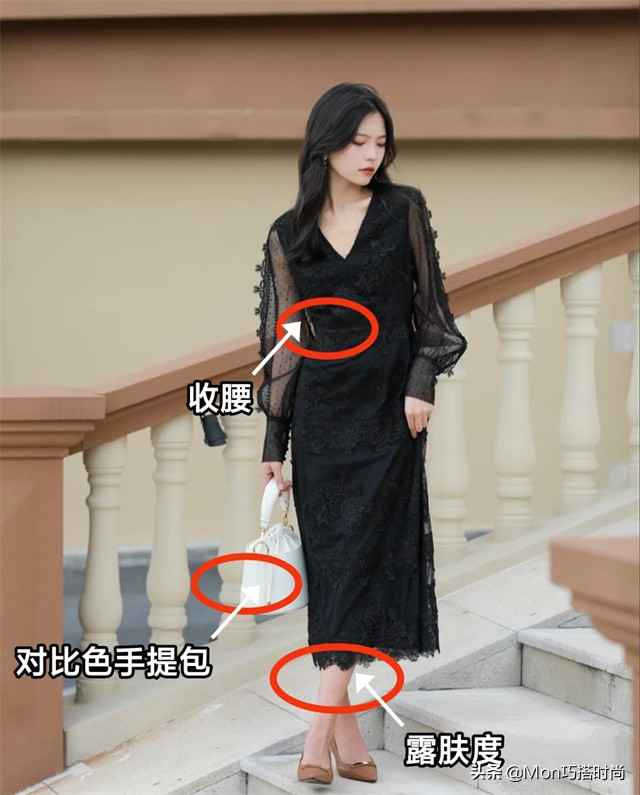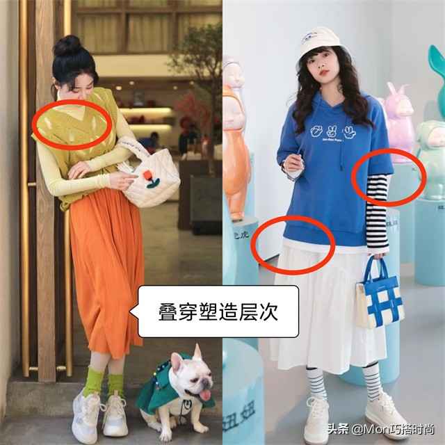 层次堆在下半身会显胖,但在领口或衣摆处加层次,裙装搭配立马高级。