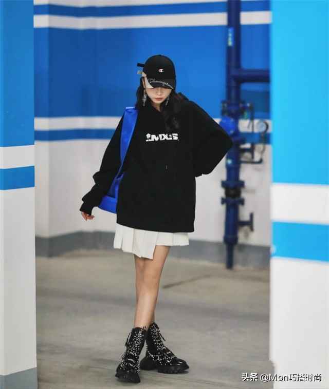 像这位小姐姐用克莱因蓝挎包配黑色长卫衣,加条不规则百褶裙,个性十足!
