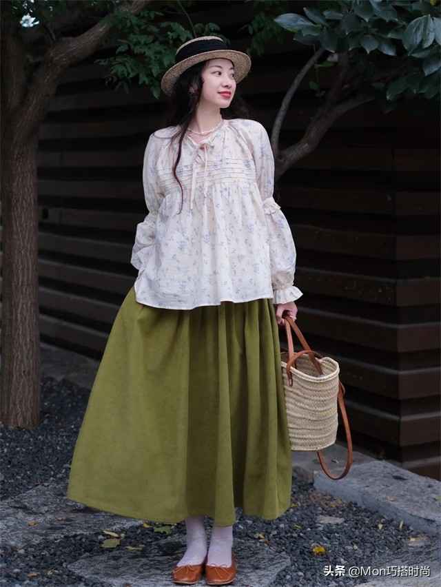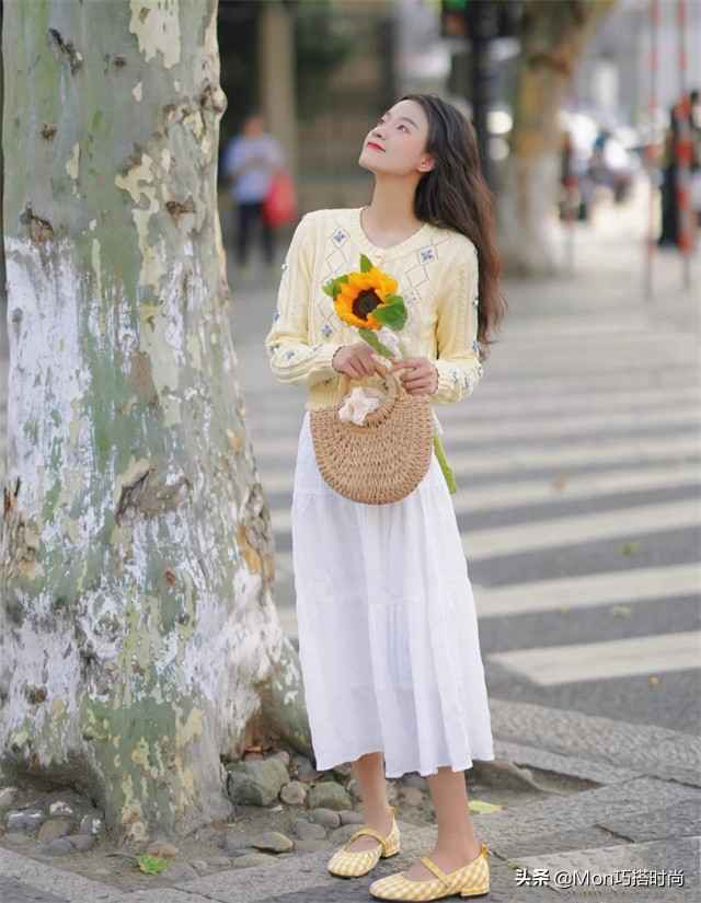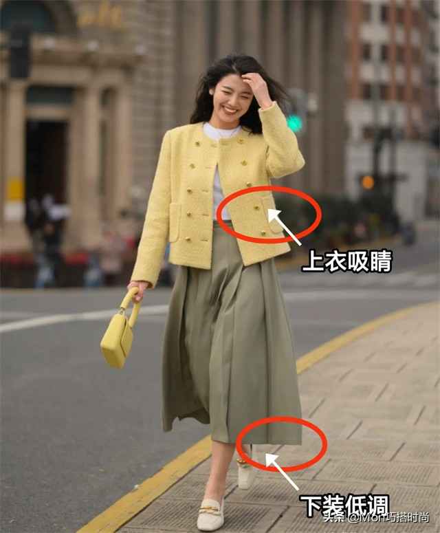 棕绿色褶皱长裙优雅低调,上身配鹅黄色外套和白T,瞬间提亮整体。