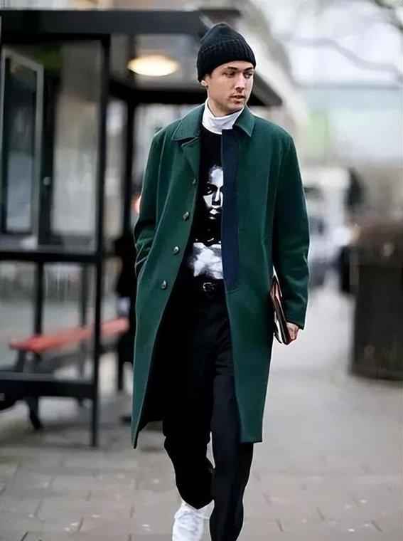 4. 墨绿毛衣加浅灰外套和藏蓝裤(冬天最提气色的绿色搭配)