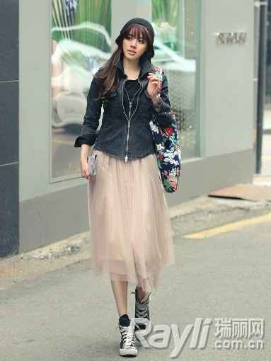 韩国时尚潮人还尝试过用解构拼接概念的夹克搭配荷叶边白裙,加上宽发带和粗框墨镜,既甜美又潇洒,最后再踩上一双复古跑鞋,酷女孩气势拉满-1。
