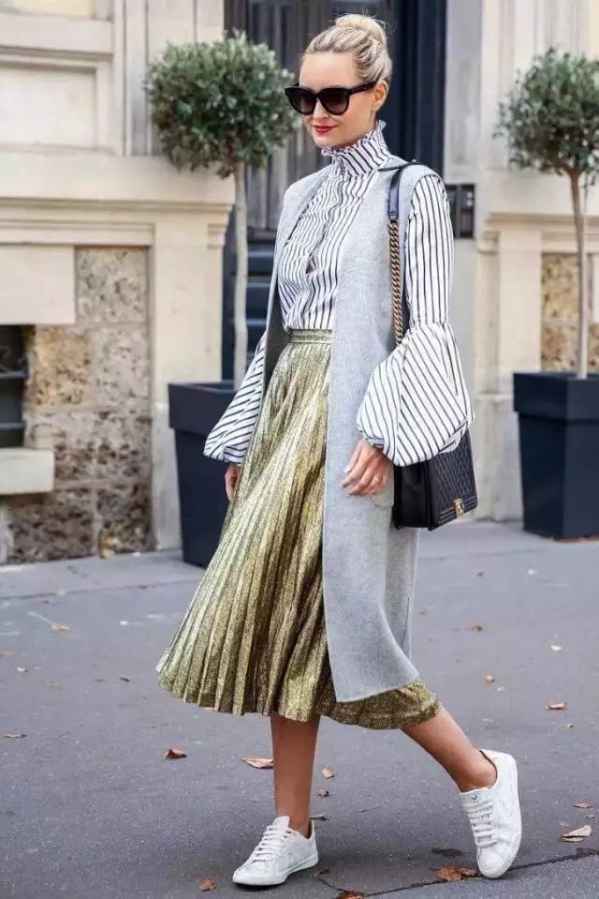 问:@时尚小白:平时上班通勤,百褶裙怎么搭配才能不死板?