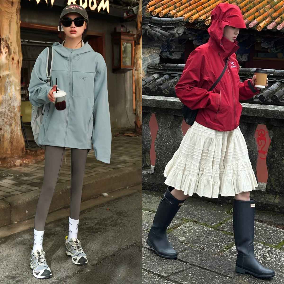 如果全身冲锋衣配登山鞋,容易像户外装备。不如用工装裤打造山系风,或搭运动装强化休闲感,让穿搭兼顾功能与美观。