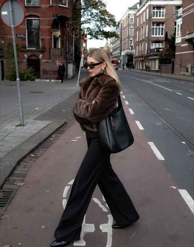 下身搭配阔腿皮裤,裤腿宽松但意外显腿长。