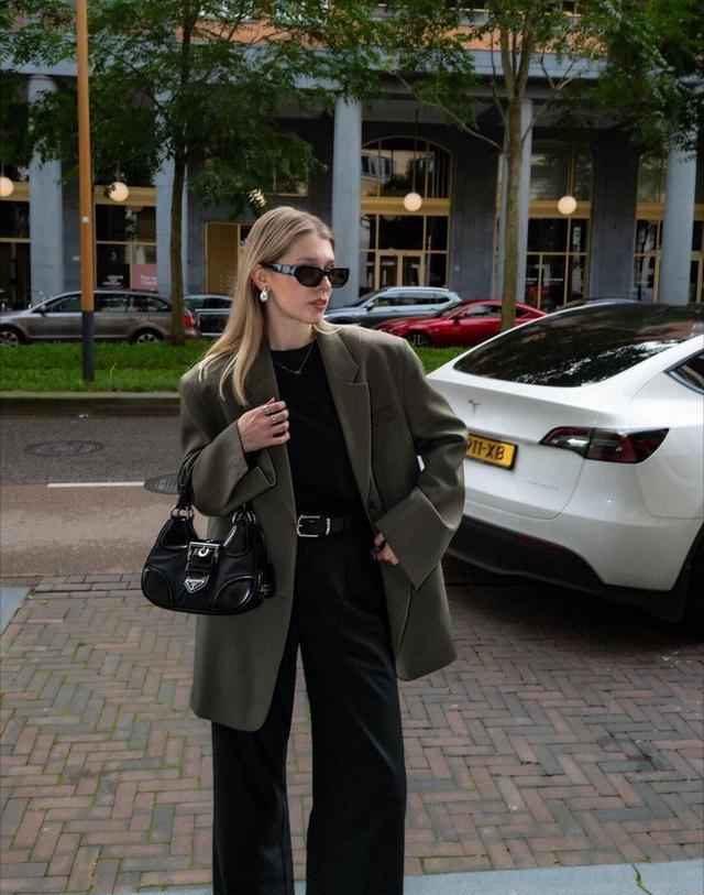 整体还是灰色系,但腰间的细腰带和迷你红包,像给造型注入活力,档次立马提升。