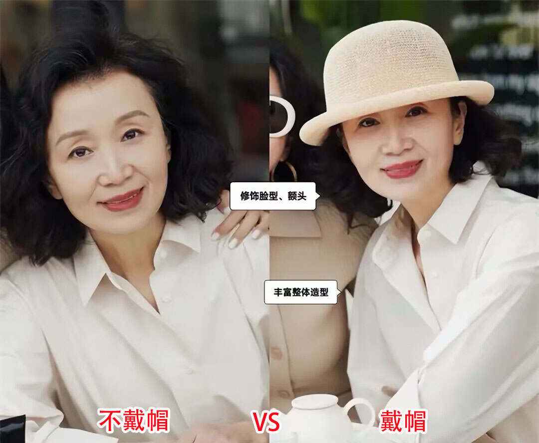 同样是穿衬衫,戴不戴帽子差别很大。戴上帽子后,像发际线高、皱纹或脸型问题都悄悄隐藏了,而不戴帽子则暴露无遗,还容易显得老气,整体美感大打折扣。
