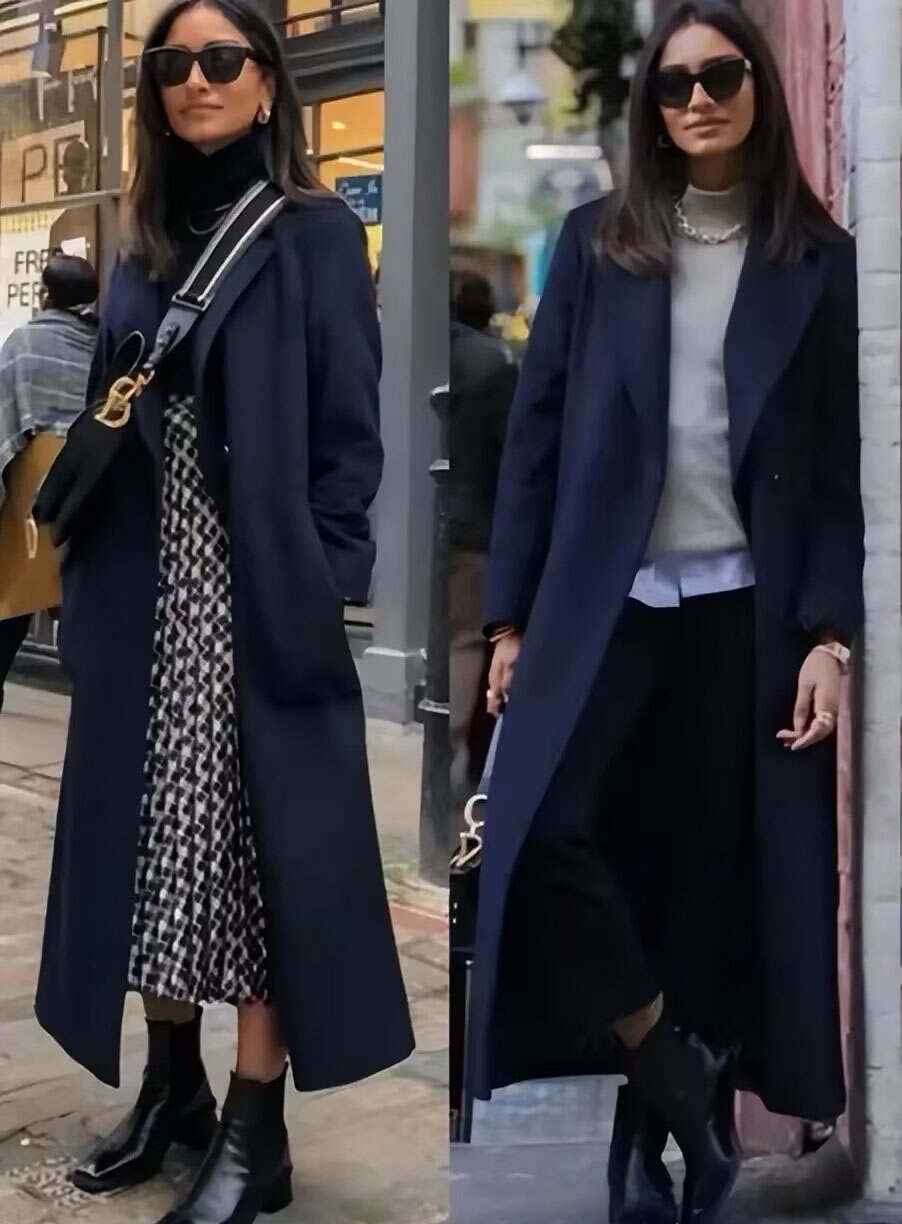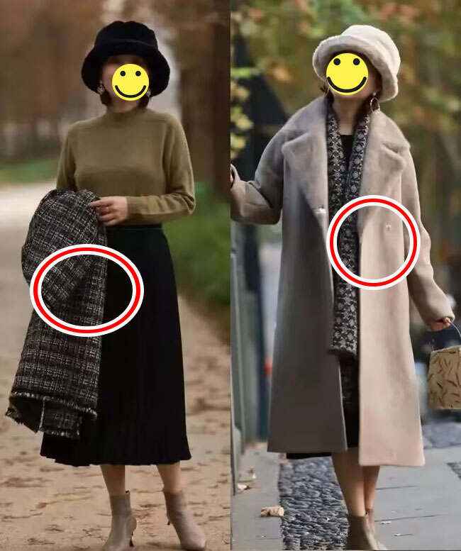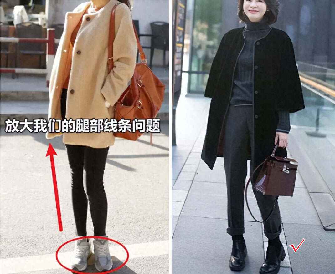 搭配要讲究风格统一,避免杂乱。比如鞋子是气质款,就别配休闲装,像图中搭气质大衣,才能穿出优雅贵气。