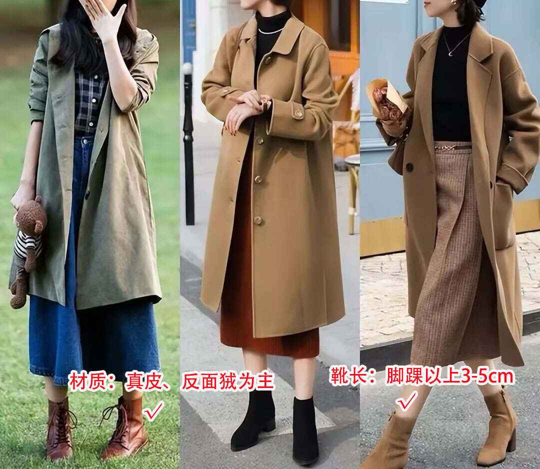 短靴更实用,风格多、百搭。选真皮或麂皮材质,筒高在脚踝以上3-5厘米,靴口窄一点,更显瘦显高。