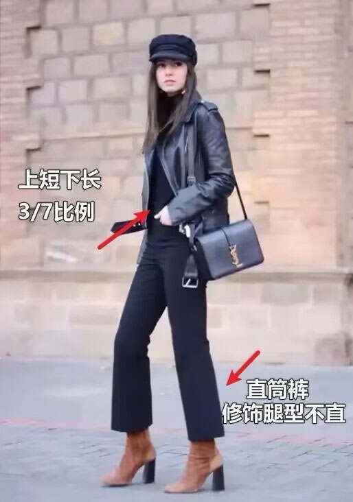 像图中这位博主,靠“上短下长”拉出三七比例,直筒裤遮住腿型问题,再加帽子和靴子,立马变身身材好、会穿的时髦精。