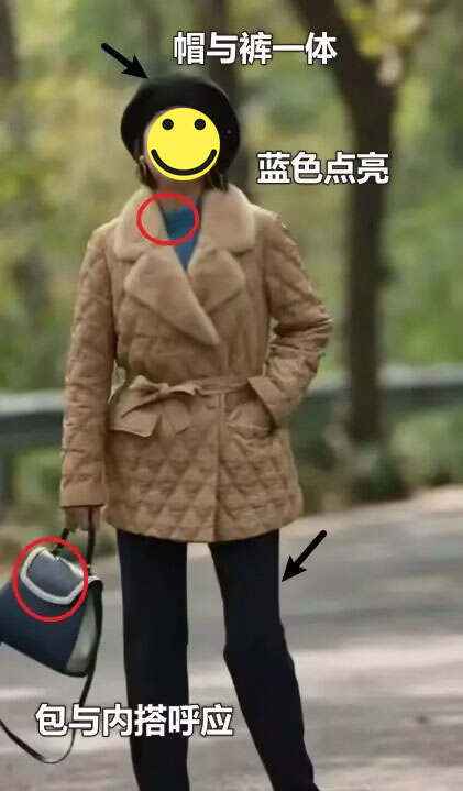 方法简单,加小面积亮色。如图中博主,帽子和裤子同色,内搭和包包蓝色呼应,靠近脸的蓝色提亮肤色和整体。