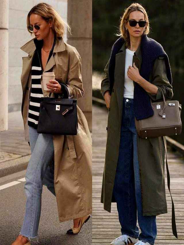 浅卡其风衣+米白针织衫+直筒牛仔裤+小白鞋+棕色或米色托特包。