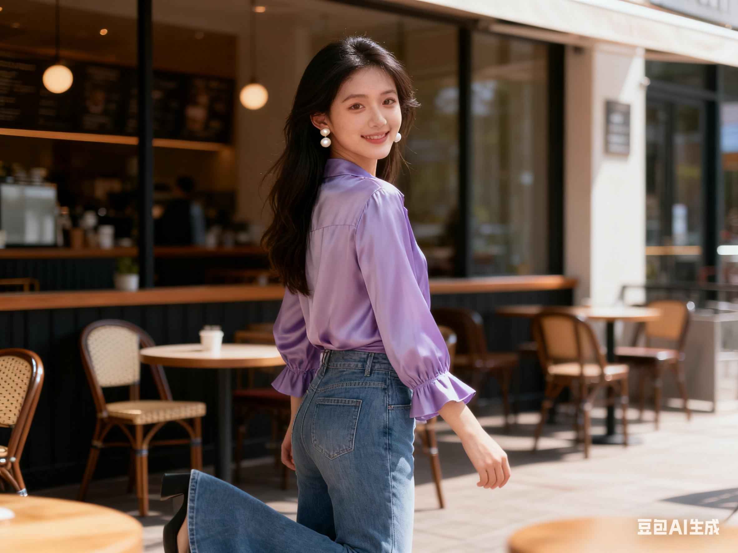 约会出游:薰衣草紫真丝衬衫+微喇牛仔裤,温柔又吸睛