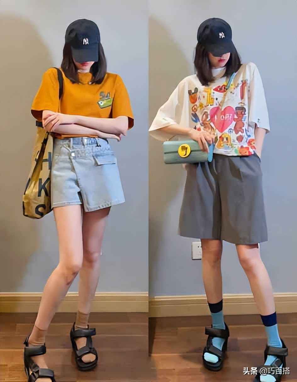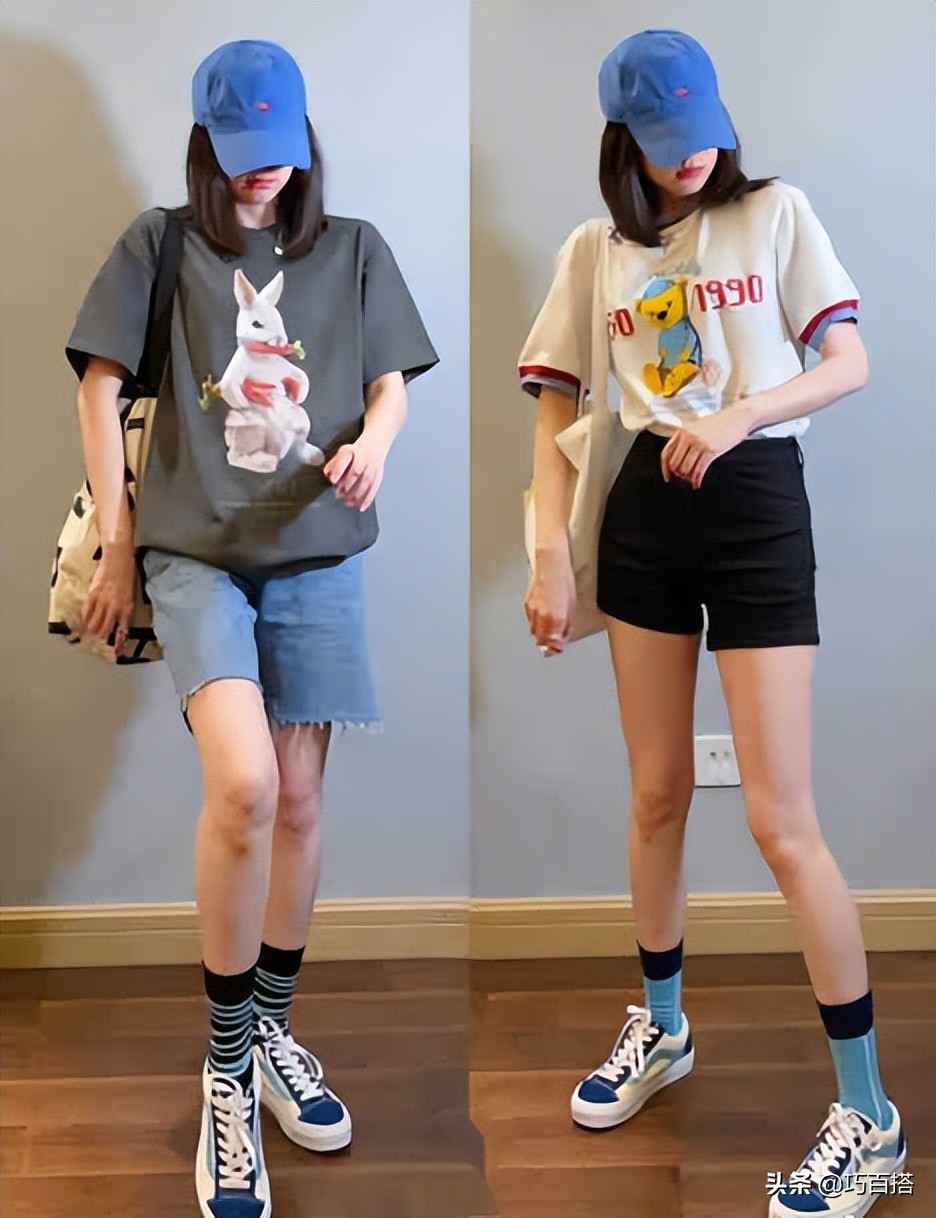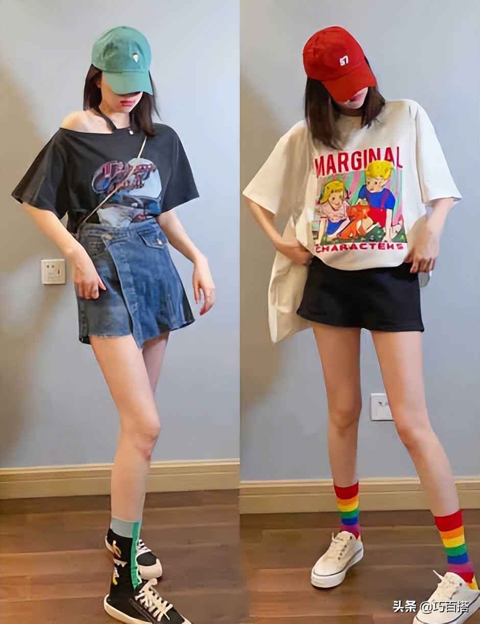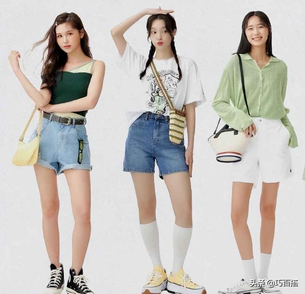 结合起来,你可以入手常规纯棉T恤(记得塞衣角)、修身露脐T恤、牛仔短裤、短裙或五分骑行裤。