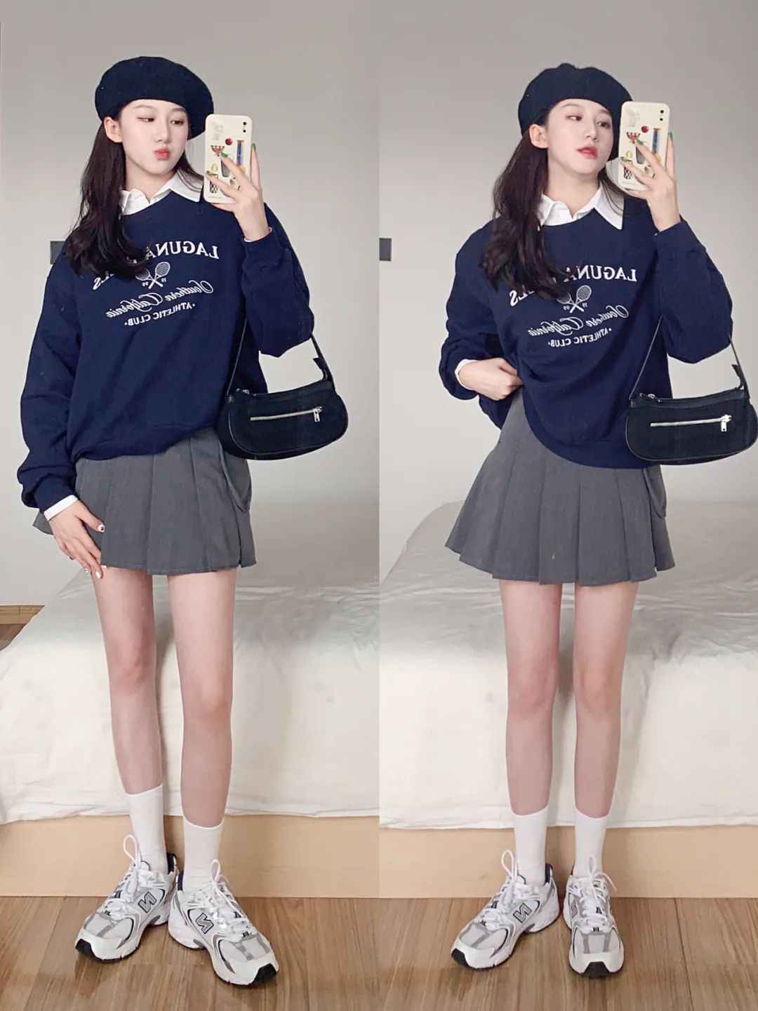 它还超级百搭,能和所有裙子裤子配。但外语学院女生要穿出复古学院风,还是得配百褶裙。