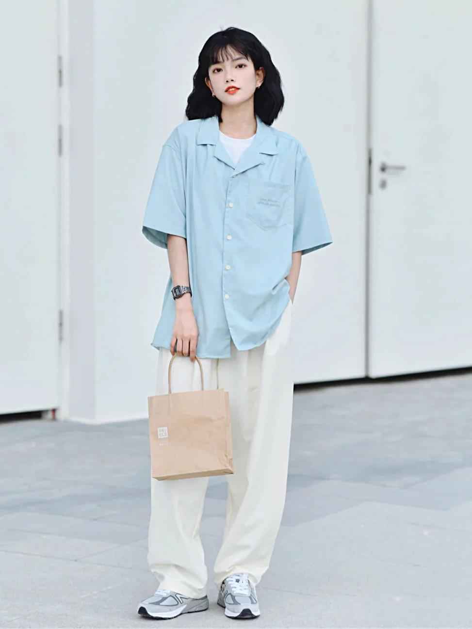 下半身配宽松西裤更慵懒,大帆布包不能少,既点睛又实用,上课方便。