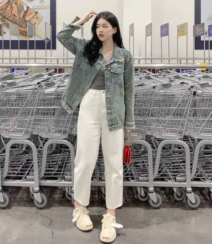 像敏敏这样穿藕粉色衬衫和长牛仔裤,如果把衣摆散着就五五分了。但她把衬衫塞进裤子,立马拉出三七比例,腿长一米八既视感!个子高了,微胖感也就弱化了。