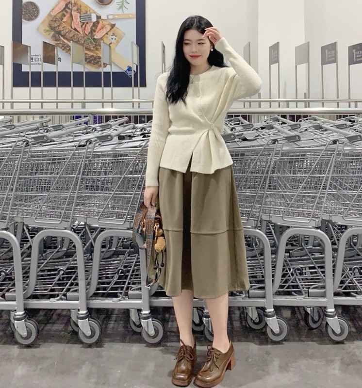 看敏敏这套:米白色掐腰毛衣搭配直筒半裙。毛衣有弹性,修身不紧绷,半裙也留出余地不贴腿。一松一紧的对比,悄悄就把肉肉藏好了,整体特别轻盈。