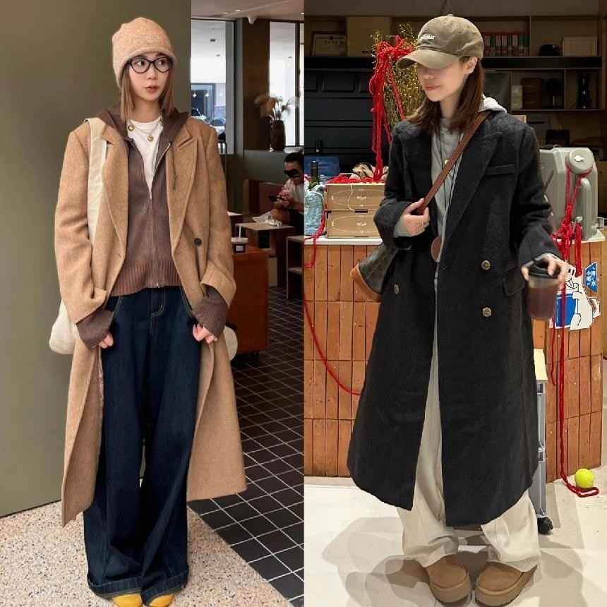 深驼色羊毛大衣内搭浅灰色加绒卫衣,下身配直筒裤和帆布鞋,上班时得体大方,下班后逛街约会也轻松自在,脱下大衣就是舒适的日常装,一衣多穿超实用。