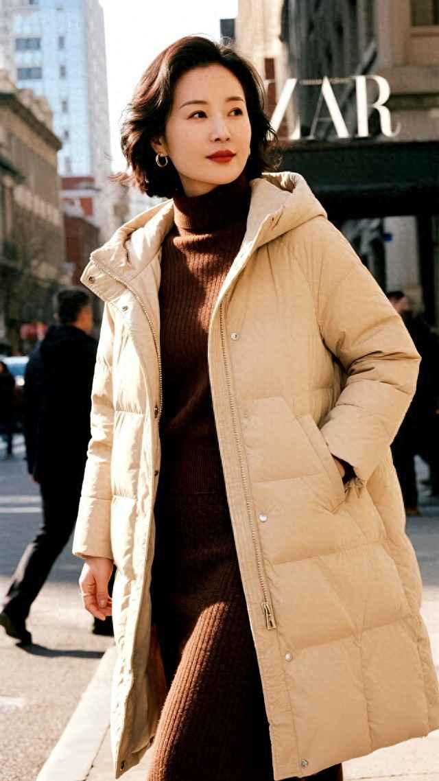 为什么选中长款?因为这个长度最实用,也最藏肉。它能盖住大腿和臀部,这正好是很多女性容易胖、没自信的地方。一件中长款外套一遮,什么腰粗、屁股大,全解决了。保暖性也更好,寒风来了腰腿都不冷。短款羽绒服虽然利落,但一抬手容易露腰,冬天受冻图啥呢?太长的又压个子,一米六的身高穿个到脚踝的,远看像移动棉被,显得拖沓。所以,到膝盖附近的中长款,是保暖、显瘦、利落三者平衡的最佳选择。