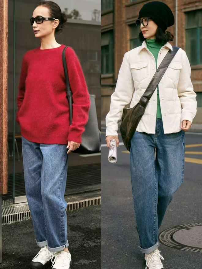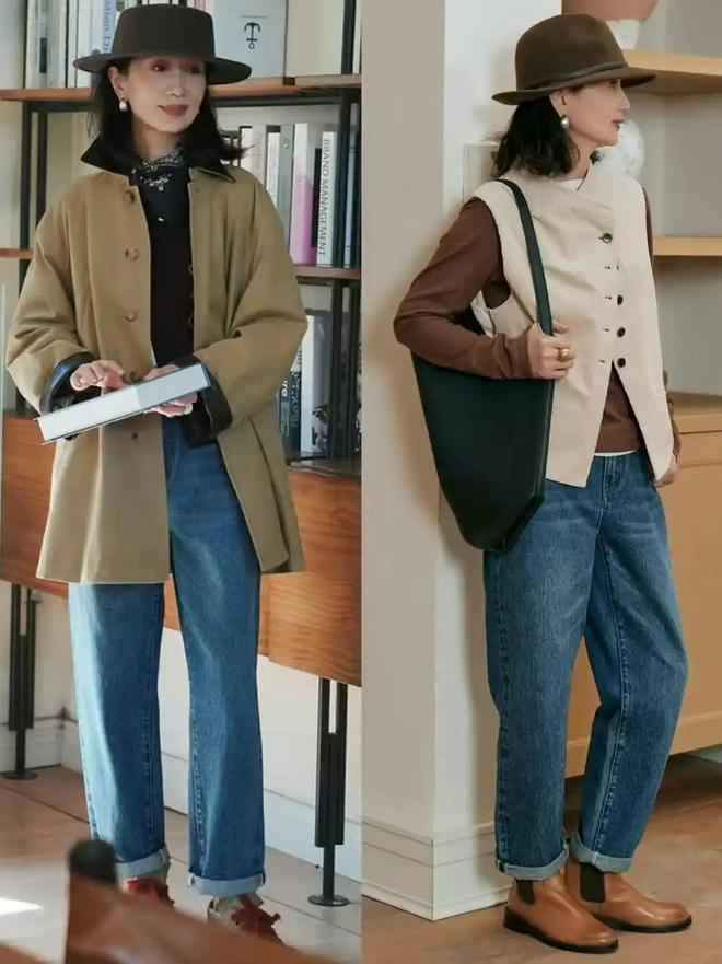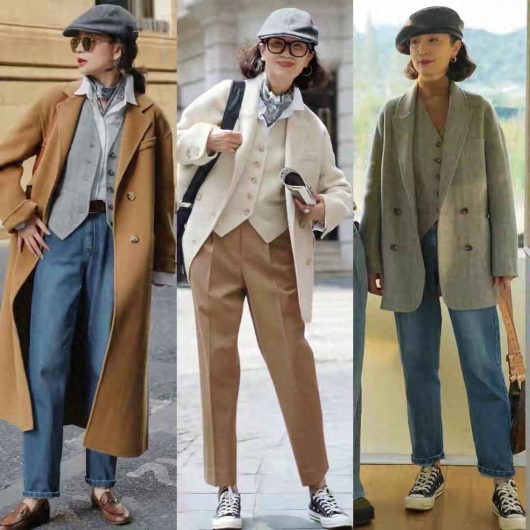 五六十岁女性想穿得简约洋气,可以用低饱和度西装叠穿针织衫,配牛仔裤和黄色德训鞋或咖色短靴,休闲又利落。