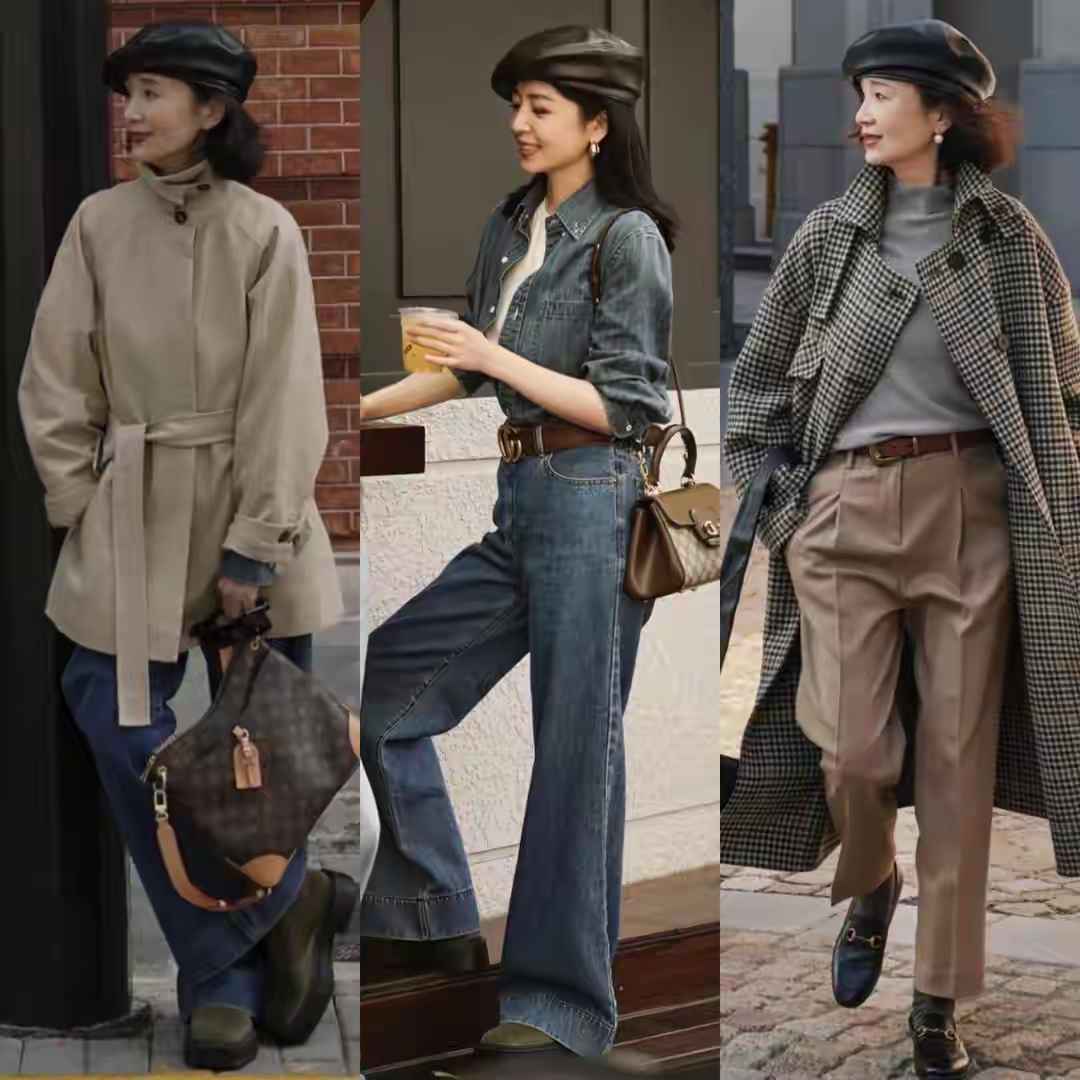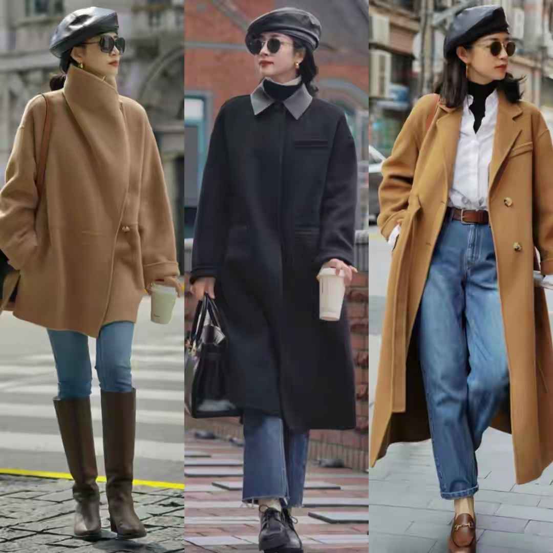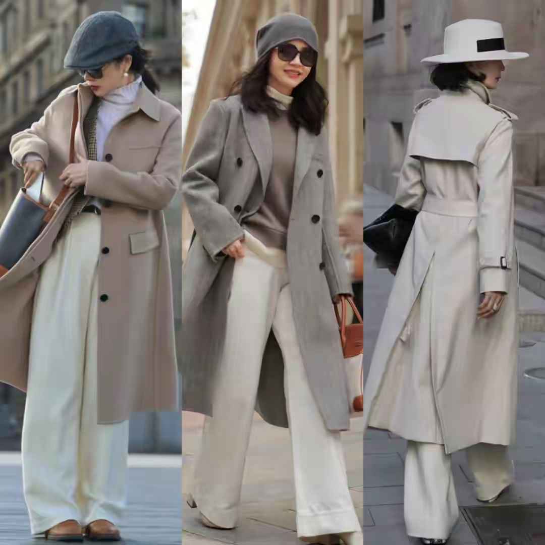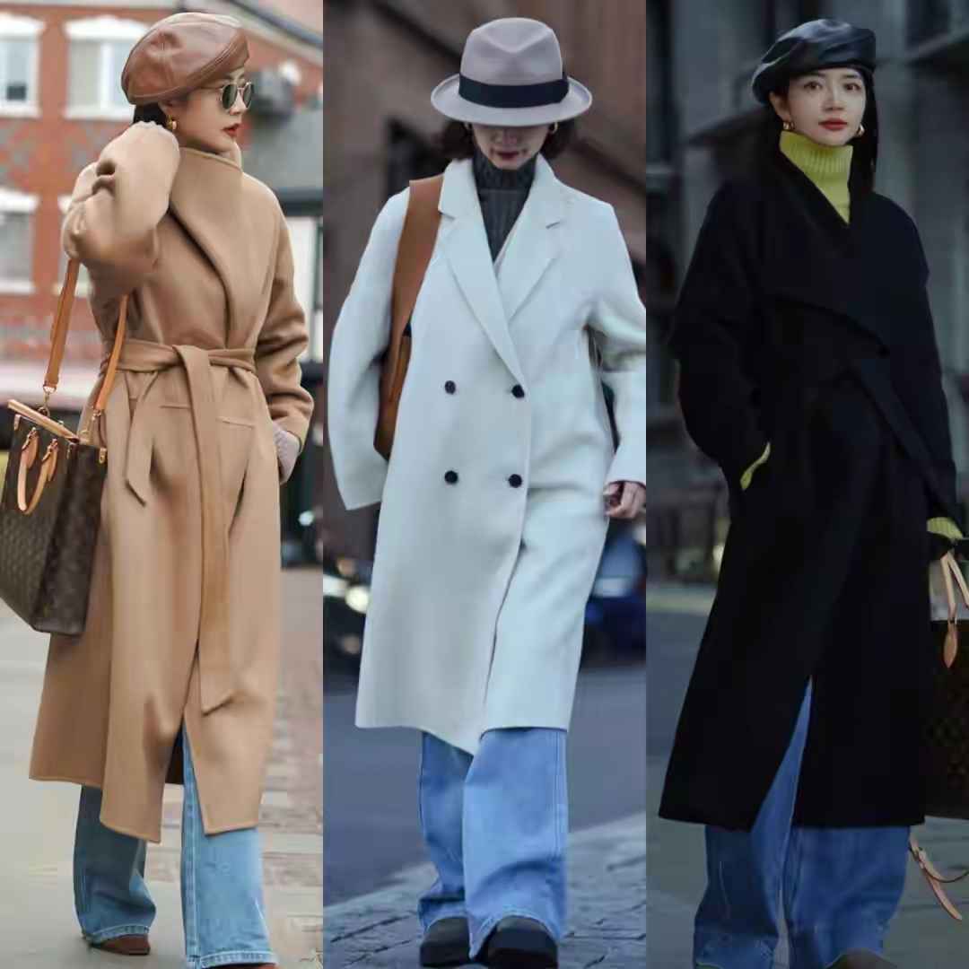 大衣是女性战袍,但颜色选错会土气。基础色如驼色、白色、黑色最安全。但全黑内搭易沉闷,可以学博主用牛油果绿毛衣配牛仔裤,撞色更活泼。