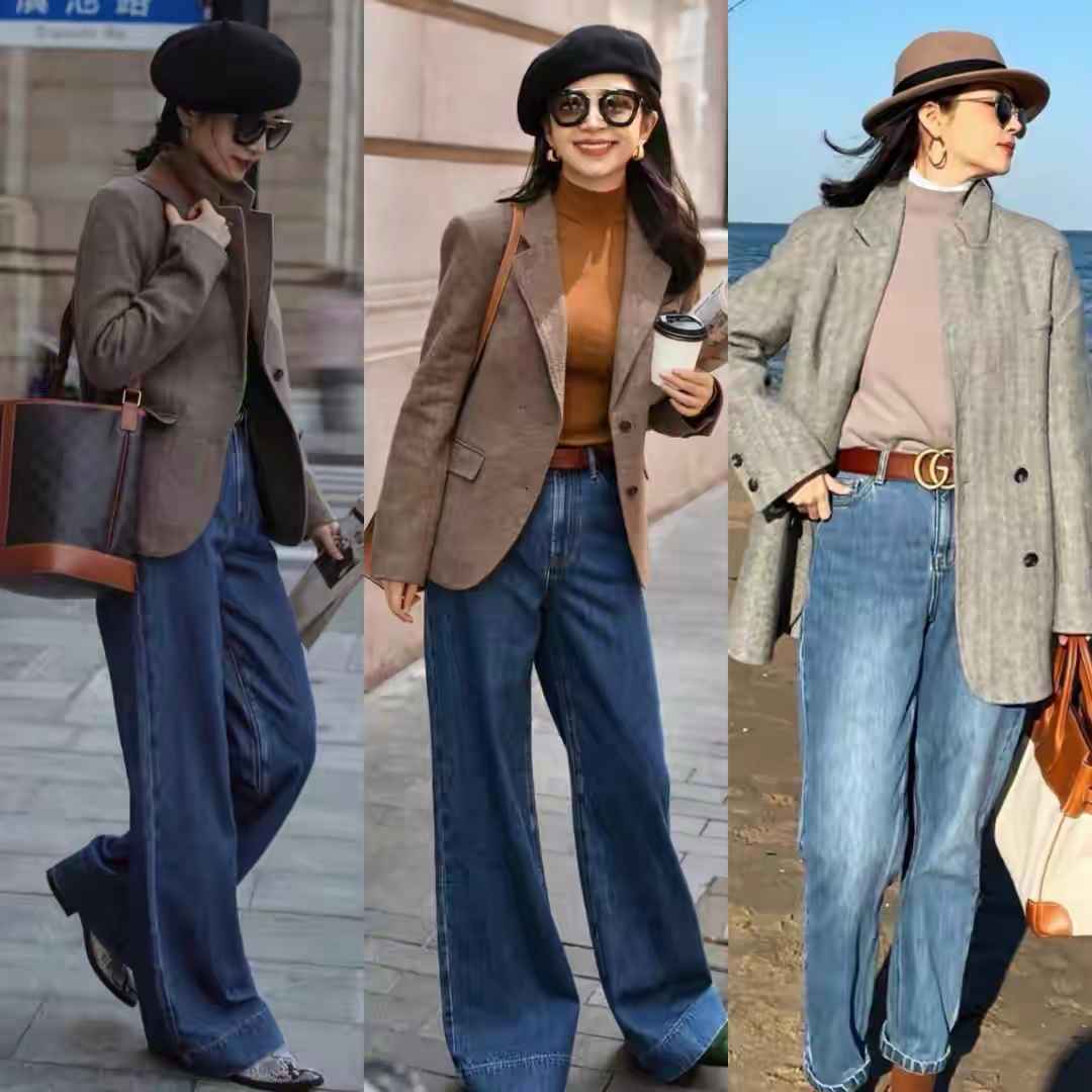 初冬温差大,用浅驼色西装内搭深驼色针织衫,配牛仔阔腿裤,低饱和度色彩显精神。