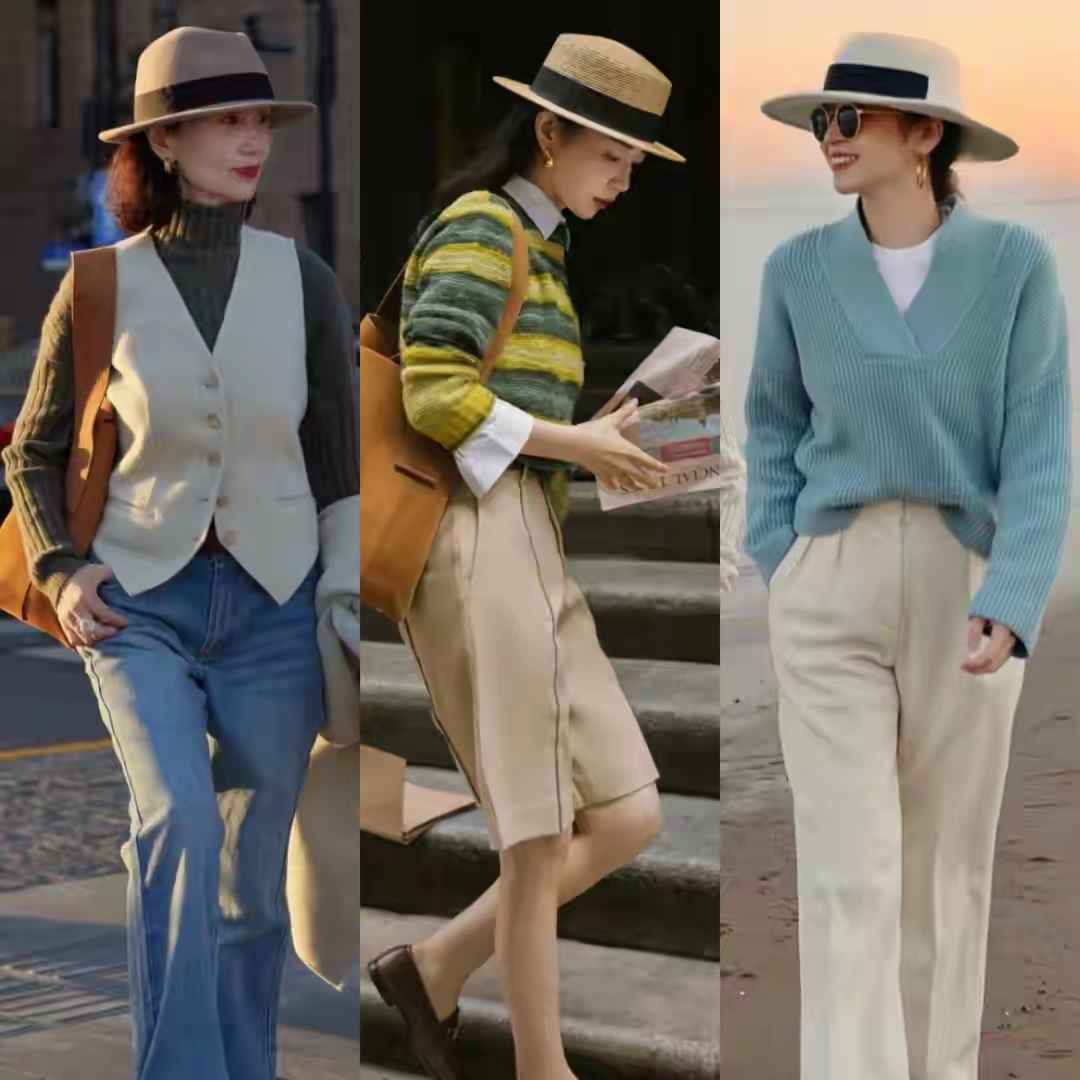 冬天最适合叠穿,比如雾霾蓝针织衫内搭白T恤,配白西裤和草帽,旅行拍照很上镜。中年女性也可以用白西装马甲配军绿色针织衫和牛仔裤,天冷加大衣,保暖有层次。