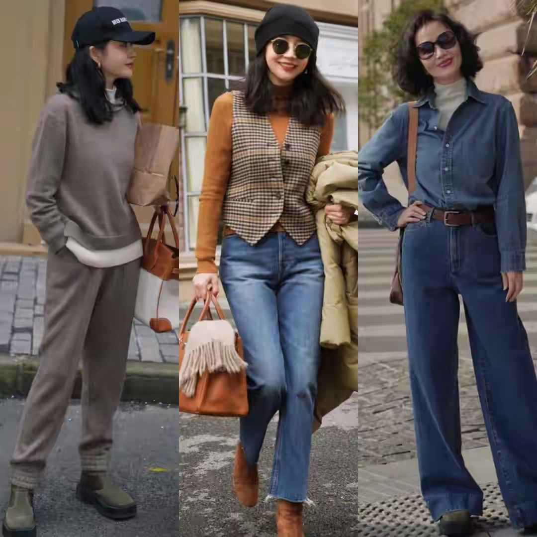 经典驼色短靴配牛仔裤和咖色针织衫,加无袖外套或马甲,适合南方女性。